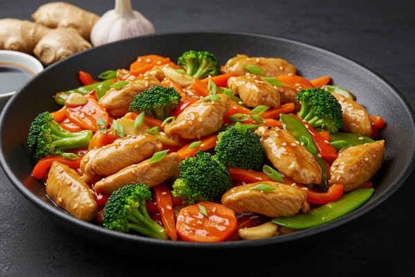 Chicken and vegetables stir-fry combines tender chicken and mixed veggies, sautéed with garlic, ginger, soy sauce, and chili.