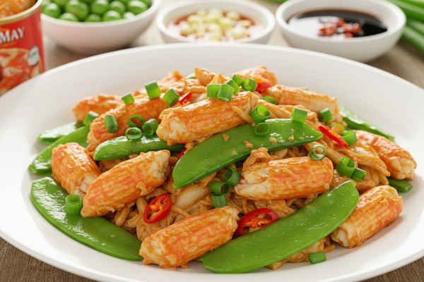 Crab meat stir-fried with snow peas in soy and chili pepper sauce with scallions.